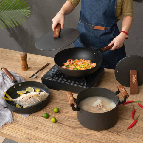 Conjunto de 2 Ollas y 1 Sartén Antiadherente en Acero Inoxidable con Mangos de Madera + REGALO: Porta Condimentos